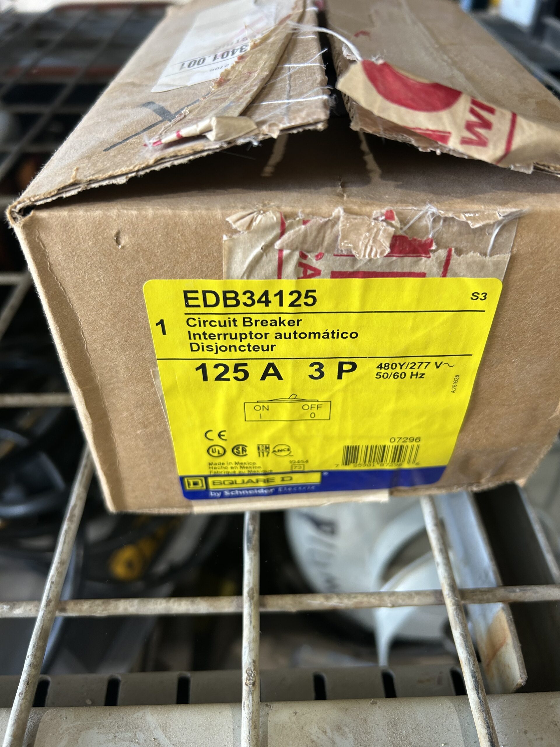 EDB34125 – Schneider Electric E-Frame miniature circuit breaker, 125A, 3 pole, 480Y/277V AC, bolt-on mounting for lighting panelboards. This thermal-magnetic circuit breaker provides superior overload and short circuit protection with Visi-Trip indicator for faster troubleshooting. Rated for NF panelboards, it features aluminum lugs and HACR-rated performance.